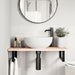 Den veggmonterte servanthyllen festes sikkert til veggen, og gir en elegant og plassbesparende løsning for badet.
